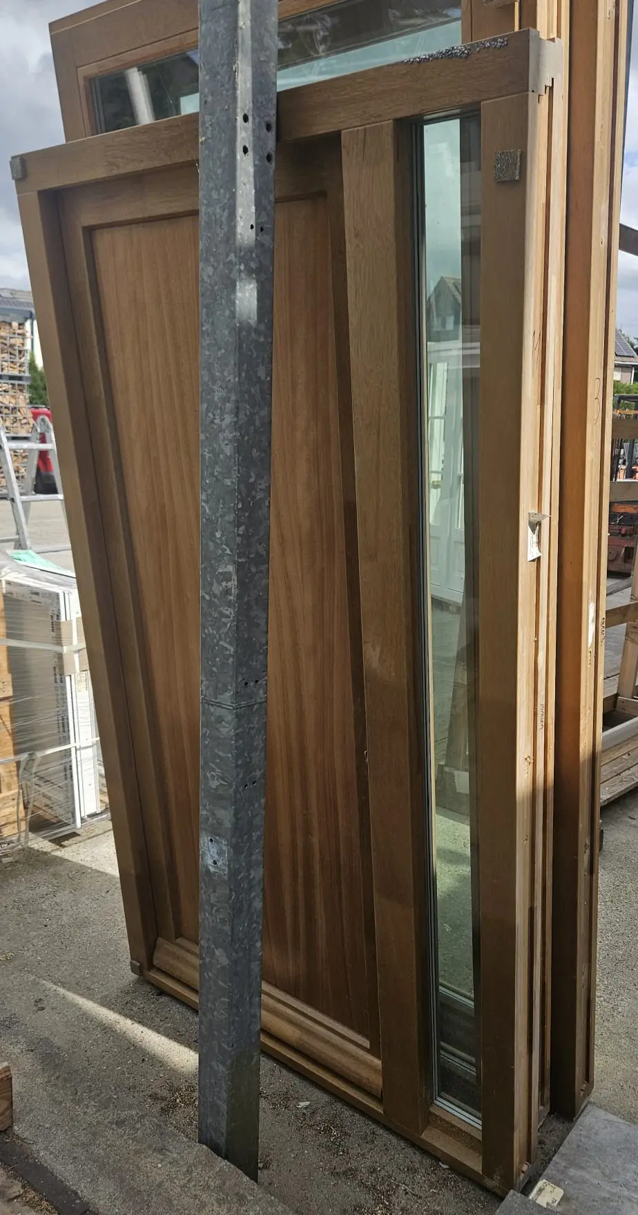 Nieuw ULM 47: meranti draaikiep deur, naar binnen draaiend bxh 1250×2595. 1x links en 1x rechtsdraaiend. 2x blank afgelakt (gevingerlast hout zichtbaar), triple veiligheidsglas, gekit met siliconenkit en inclusief beslag van €4868,- voor €1950,- ex btw